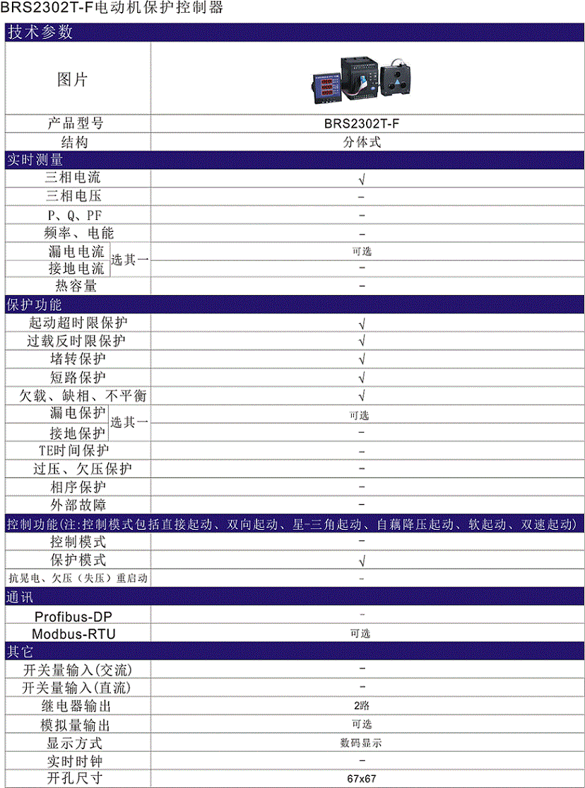 BRS2302T智能電機保護控制器是我公司針對電動機在各種應用場合產生的故障而研發(fā)的電動機保護裝置。適用于保護交流50Hz,額定工作電壓為380V的各種電機。對電動機的短路、過載、堵轉、斷相/不平衡等故障引起的危害予以保護。
