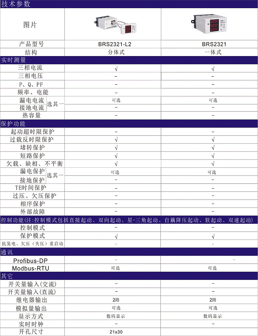 BRS2321是一款實用型、多功能的電動機保護裝置。采用先進的分體組合結(jié)構(gòu),可實現(xiàn)一體式、分體式安裝以及主回路穿芯式、端子式接線方式,對電機的短路、過載、堵轉(zhuǎn)、斷相/不平衡、欠載、漏電、定時限等故障引起的危害予以保護,并保存最大8條故障記錄。
