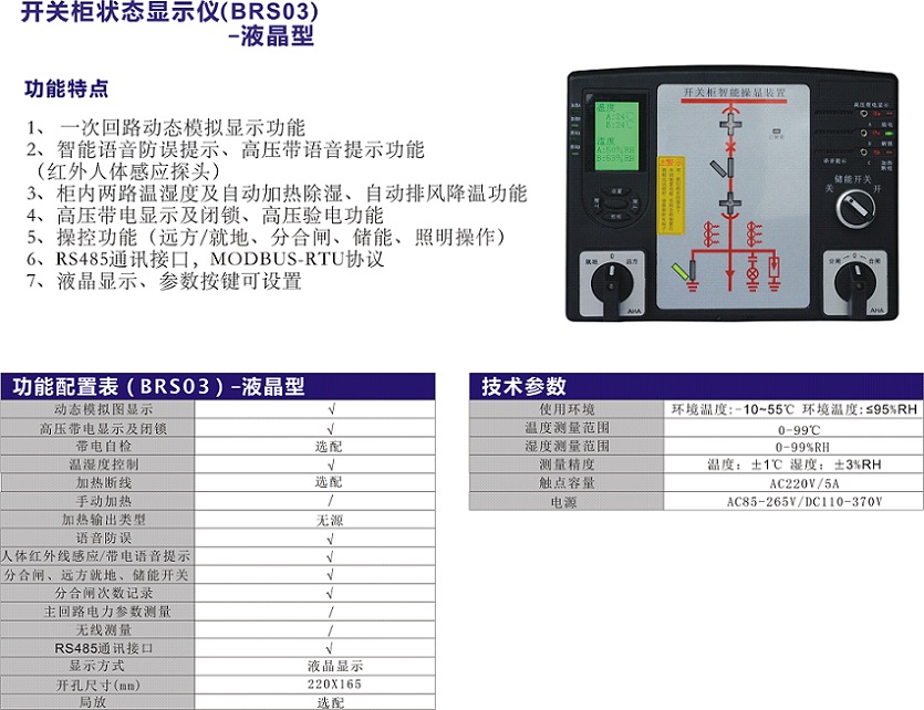 BRS03開關(guān)柜智能操顯裝置是根據(jù)當(dāng)前高壓系統(tǒng)開關(guān)柜技術(shù)發(fā)展而設(shè)計(jì)開發(fā)的一種新型的模塊化、智能型的操作測(cè)量顯示控制裝置。產(chǎn)品集中指示一次回路模擬狀態(tài)、手車位置、隔離刀位置、接地刀位置、開關(guān)狀態(tài)、操作機(jī)構(gòu)儲(chǔ)能狀態(tài);帶有高壓帶電指示、帶電閉鎖輸出、自動(dòng)加熱除濕、實(shí)時(shí)數(shù)字顯示溫濕度值及加熱器故障監(jiān)測(cè)、超高溫報(bào)警并強(qiáng)制停止加熱、智能語音防誤提示、RS485通信接口等多種功能,簡化了開關(guān)柜面板設(shè)計(jì),美化了部局,完善了開關(guān)狀態(tài)指示功能和安全性能。目前該系列產(chǎn)品已廣泛地應(yīng)用于電力、化工、鐵路、礦山、冶金、水泥等諸多行業(yè)。