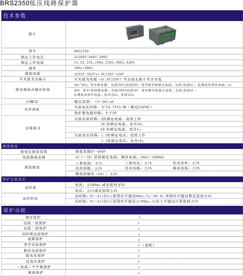 BRS2350低壓線路保護(hù)器為低壓回路提供了一整套集控制、保護(hù)、測量、計量和通迅于一體的專業(yè)化解決方案,同時提供了遠(yuǎn)程自動控制、現(xiàn)場直接控制、面板指示、信號報警、操作記錄、脫扣報警記錄及開關(guān)量記錄等功能,大量適用于電力、石化、輕工、煤炭、造紙、鋼鐵、冶金等諸多行業(yè)。