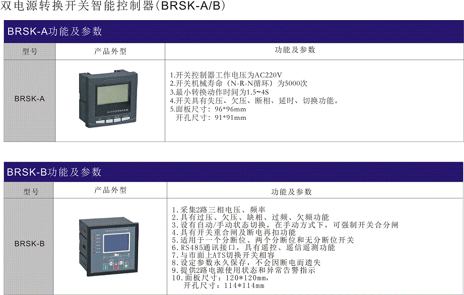 BRSK-A/B系列雙電源轉(zhuǎn)換開關(guān)智能控制器是一個具有可編程功能,自動化測量、LCD顯示、數(shù)據(jù)通訊為一體的智能化雙電源切換控制器。雙電源轉(zhuǎn)換開關(guān)智能控制器提供了雙路電源轉(zhuǎn)換開關(guān)(ATS)所必要的監(jiān)控與保護(hù),以確保切換開關(guān)維持正常的運(yùn)行。